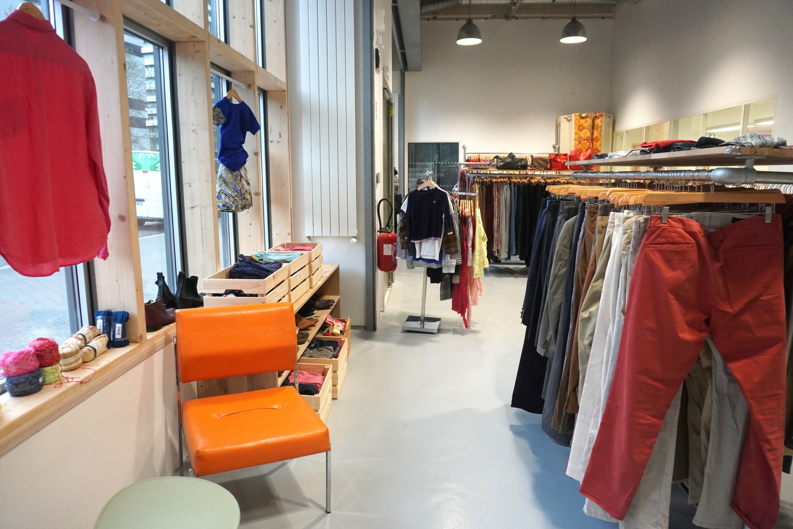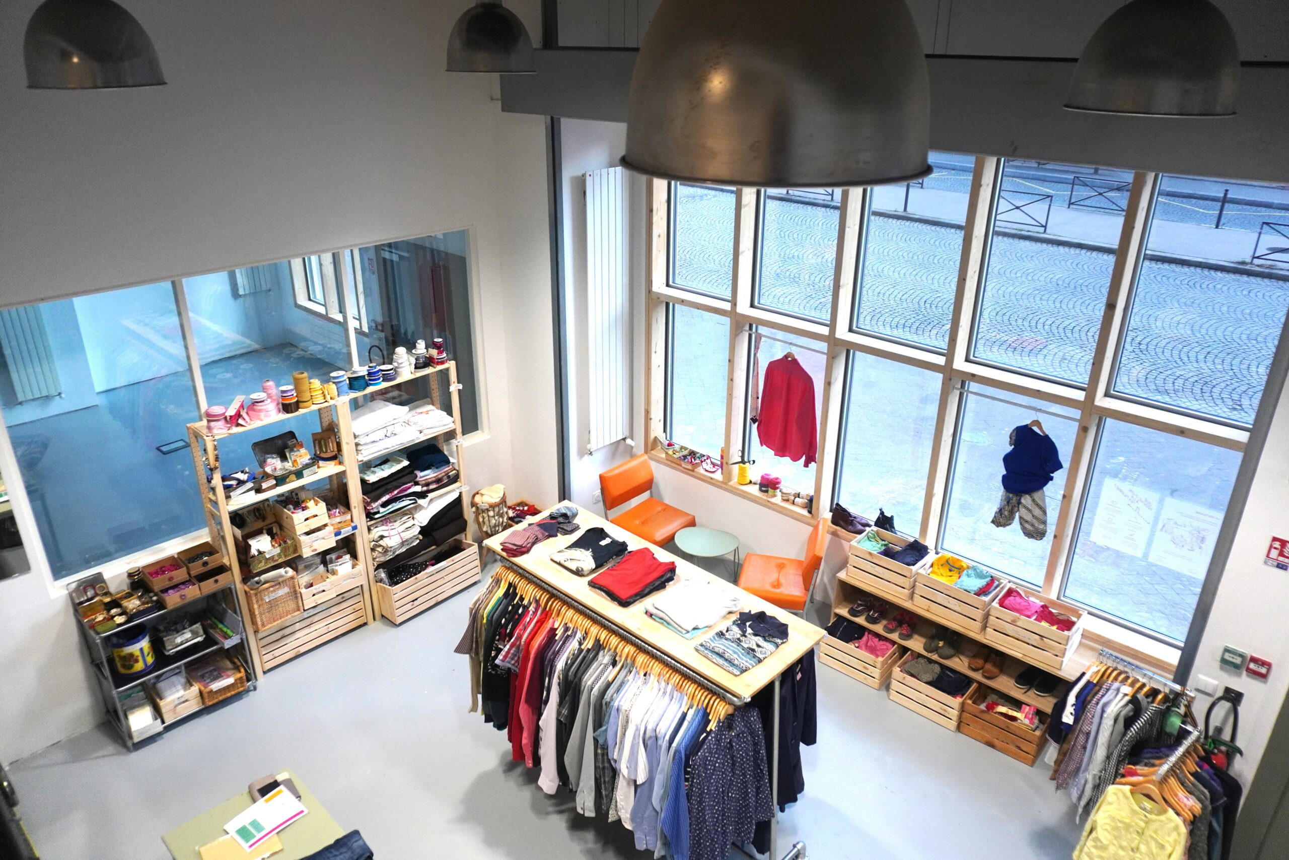 Venez découvrir ce très bel espace de 60m2 entièrement dédié au textile de seconde main : vêtements femmes, hommes et enfants, accessoires, chaussures, maroquinerie, mais aussi coupons de tissus et articles de mercerie. Également point d’apport volontaire, vous pouvez y déposer tous vos textiles usagés/inutilisés. Derrière la boutique se cache l’atelier où nous organisons plusieurs cours de couture chaque semaine, ainsi que différents ateliers à destination des habitant.e.s du quartier. A l’étage de ce grand bâtiment, vous pouvez aller boire un verre, voir des concerts ou manger les délicieux plats préparés par Mam’Ayoka. La programmation y est savamment éclectique (un aperçu ici), le lieu est ultra chaleureux, la terrasse verdoyante !